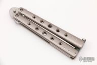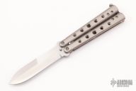 This Balisong by Chuck Gedraitis features a satin finished blade with a false top edge. The handles are titanium with titanium backspacers and a G-10 T-Lock. Excellent condition. Includes a velcro sheath.