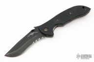 'The Emerson Commander is a 21st century combination of design, materials, performance, and razor sharpness. This knife along with other Emerson Knives, sets the new standard for the cutlery industry and continues to push the design and performance envelope for cutting tools well into the 21st century.' 'The Commander knife-battle tested and proven-incorporates some of the most advanced ergonomics ever featured on a folding knife. The knife, already in use with elite armed forces, European Military strike teams and NATO Counter-Terrorist units throughout the world was chosen by the U.S. Navy SEAL teams for issue to special units within the Naval Special Forces Units. Because of its ruggedness, it has become a favorite of hunters, outdoorsman and adventurers the world over. It features the patented 'wave shaped opening feature.' This production Commander linerlock folder has a black partially serrated blade and black G10 handle. Wave feature. 1999. Has some light scuffs and scratches, otherwise great condition.