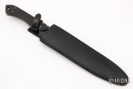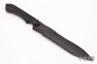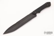 This knife by Alex Collins features a black partially serrated blade with A-symetrical grinds, notched thumbrest, .257" blade stock and 1.647" blade depth, full tang construction with rubber scales, extended tang with lanyard hole. Comes with a black leather sheath. Has epoxy coating on the spine and underside of tang, has a few light scuffs, otherwise good condition. Dated 1995