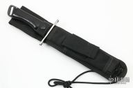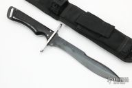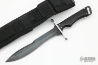 This Fighter by Alex J Collins features a black blade with sharpened top edge, .199" blade stock and 1.424" blade depth, full tang construction. The handle has a welded steel guard with black linen micarta scales. Comes with a black nylon sheath. Has some light scuffs and oxidation spots, otherwise excellent condition.