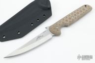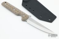 This Kwaiken Fixed Blade by Ernie Emerson features stonewash finished blade with notched thumbrest, .126" blade stock and .977" blade depth, full tang construction. The handle has green canvas micarta scales. Comes with a kydex sheath and original box. Excellent condition. The blade is signed by Ernie Emerson and is #40 of 63.