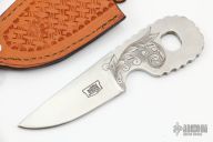 This neck knife by Lowell Bray features a satin finished blade with .184" blade stock and 1.037" blade depth, full tang construction. The handle has fileworked edges and engraving by the maker. Comes with a hand tooled brown leather neck sheath. New from maker.