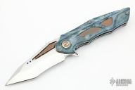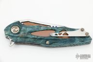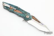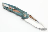 This Noah Flipper from Dew Hara features a VG-10 Core San Mai Damascus blade with copper inserts and lapis ball inlays, notched thumbrest and flipper. The handle has stabilized poplar scales with copper inlays, textured stainless steel liners and a an antiqued copper backspacer. Skeletonized stainless steel tip up clip is positioned for right hand carry. Includes velcro cloth pouch, original box and COA dated 12/2018 and "1 of 1". Nice detent and lockup, rides on bearings. Excellent condition.