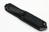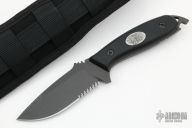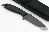 This Specwar 4 from Blackwater Gear features a black coated partially serrated spear point blade with notched thumb rest designed as a wire stripper in the three most popular gauges. The handle is comprised of black G10 over full tang construction. Pommel features lanyard hole, glass breaker, bottle opener. Includes nylon sheath, original box and papers. Excellent condition.