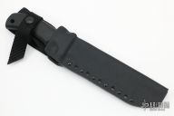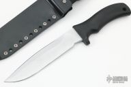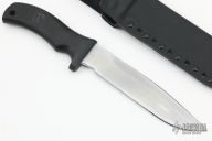 This Early 2000s Voodoo Hound by Mad Dog Knives features a double edged blade with .248" stock and 1.415" blade depth. Selectively tempered, the knife has a Rockwell C-scale hardness of 62 at the edge (as hard as a file), and HRC 50-54 throughout the spine and hidden full tang. Hard chrome blade finish. The handle is designed to be ergonomic and has the ability to withstand tremendous punishment with little or no damage. It is hard and tough enough to be used as an impact tool. Includes a kydex sheath with belt loop. Has some light scratches, otherwise excellent condition.