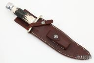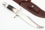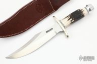 This Randall Model 12-8 Bear Bowie features a satin finish bowie style blade with sharpened top edge crafted from stainless steel, .219" blade stock and 1.644" blade depth, hidden tang construction. The handle is comprised of nickel silver guard and duralumin butt, black/duralumin spacers and a stag grip. Includes a brown leather sheath. Excellent condition.