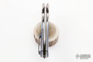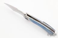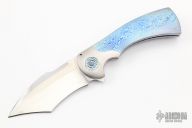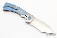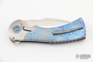 This One Off Fury Flipper by Frank Fischer features a hand rub satin finished tanto recurve blade with a false top edge and a notched flipper. The handle has a orange peeled titanium frame with polished edges, timascus scales, timascus inlaid custom titanium pivot, timascus pivot collars, San Mai Damascus tip up clip with hidden screws and a notched backspacer. Nice detent, lockup, action and blade seating, rides on bearings. Comes with hard case. Excellent condition. Hard to come by!
