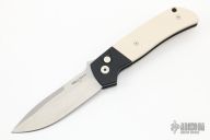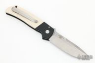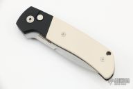 This ATCF Auto by Pro-Tech features a stonewashed Magnacut blade with notched thumbrest. The handle has a black aluminum frame with ivory paper micarta scales, tip up milled titanium clip with hidden screws. Comes with original box and papers. New from maker.