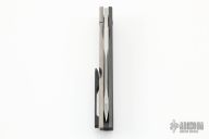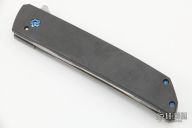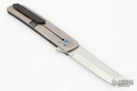 This Hamachi Framelock Flipper from Pohan Leu has a satin finished tanto blade with swedge and flipper. Lock side frame is orange peel finished titanium with a lightning strike carbon fiber backspacer and tip up clip, zirconium front scale, anodized titanium hardware. Nice attention to detail. Dead center blade seating, and rock solid lockup, nice detent. Comes with a zippered case. Excellent condition.