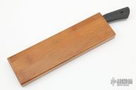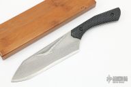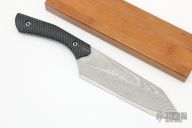 This Santoku by Brandon Corbin features a San Mai Damascus blade with .114" blade stock and 1.814" blade depth, full tang construction. The handle has C-Tek scales. Comes with a bamboo scabbard. Has a few light scratches, otherwise excellent condition.