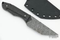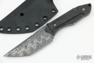 This knife by Brandon Corbin features a chisel ground Damascus tanto blade with false top edge and notched thumbrest, .150" blade stock and 1.178" blade depth, full tang construction. The handle has milled carbon fiber scales. Comes with a kydex sheath. Excellent condition.
