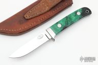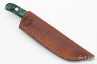 This Hunter from Richard A. Rotella features a mirror polished blade with .169" Blade Stock and .839" Blade Depth, full tapered tang construction. The handle is comprised of a stainless steel single guard and green acrylic scales over black liners. Lanyard tube in pommel. Includes brown leather sheath. Excellent condition. #043