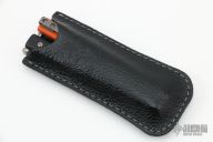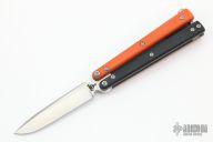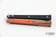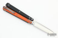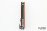This Harley Quinn by Atropos features a satin finished blade. The handles have orange and black G-10 scales, bead blasted titanium liners and spacers and a tip up tumbled titanium clip. Comes with original black leather sheath and zippered case. Excellent condition.