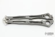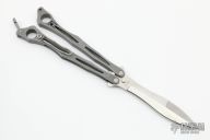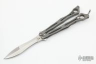 This Spyderfly Balisong by Spyderco features a satin finished spear point VG-10 blade with a false top edge. The handles are bead blasted stainless steel with a tip up clip (4-way reversible). Has scuffs, otherwise good condition.  Comes with a zippered case.