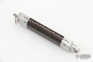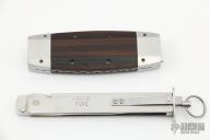 This Prototype Barrel Knife by Burn Knives features a mirror polished blade with false top edge. The blade sets in a stainless steel frame that holds the blade in the open and closed positions. The handle has stainless steel bolsters, fileworked stainless steel center frame, cocobolo scales. Comes with a zippered case. Excellent condition.
