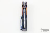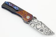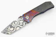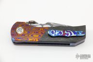 This Variant Linerlock by Robert Carter features a hand rub satin finished Damascus blade with swedge and MokuTi thumbdisc. The handle has Robtanium bolsters and pivot collars, marble carbon fiber scales, anodized and orange peel finished titanium liners with jeweled interiors, Robtanium backspacer and tip up clip. Excellent condition. Nice detent, lockup and blade seating. Comes with a zippered case.