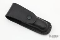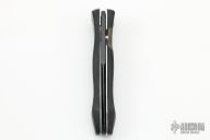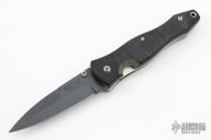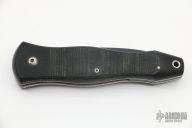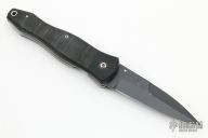 This linerlock folder by Robert Bauchop features a black Kalguard coated spearpoint blade with false top edge and single thumb stud. It has contoured black linen micarta scales and features a liner lock with titainium liners and black micarta backspacer. Numbered 88 on back of blade. Nice detent, lockup and blade seating. Has some light scratches on the blade, otherwise excellent condition. Comes with a black leather sheath.