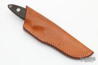 This knife by Bill Sanders features a satin finished drop point blade with false top edge, .198" blade stock and 1.096" blade depth, full tapered tang construction. The handle has black linen micarta scales with stainless pins. Comes with a brown leather sheath. Excellent condition.
