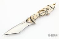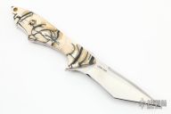 This Utility Tanto by Jerry Hossom features nicely shaped stabilized cross cut mammoth ivory scales with red liners brass and mosaic pins. Hand rubbed satin finished tanto blade with notched thumbrest and sharpened top edge, .156" blade stock and 1.091" blade depth, full tapered tang construction. Fits nicely in hand. Includes a zippered case. New from maker.