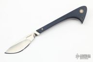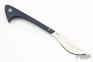 This custom Bird & Trout knife from Jerry Hossom features a hand rub satin finished blade with notched thumbrest and secondary, "rope cutter" like cutting area, .126" blade stock and .799" blade depth, full tapered tang construction. The handle has blue Richlite scales with white liners, brass and mosaic pins and lanyard hole. New condition, shows no signs of use. Comes in a padded/zippered case.