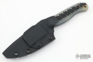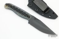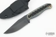 This Featherlite by Half Face Blades features a black cerakoted blade with a notched thumbrest, .109" blade stock, 1.168" blade depth, full tang construction.  The handle has black/jade G-10 scales.  Comes with a kydex sheath with clip and original box. New Condition.