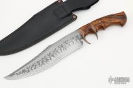 This Sub-Hilt Fighter by Jan Hafinec is beautiful. It features a recurve blade (C105 Carbon Steel) with amazing hamon and sharpened top edge, .211" blade stock and 2.078" blade depth, hidden tang construction. The handle has an antiqued bronze guard and sub-hilt with an ironwood grip, brass pin. Comes with a nice black leather sheath and a zippered case. New from maker. The hamon on this knife looks like the fires of hell!