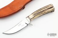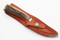 This Skinner by Gil Hibben features a mirror polished blade with fileworked spine, .203" blade stock and 1.122" blade depth, hidden tang construction. The handle is comprised of a nickel silver guard and a stag grip handle with nickel silver pommel  and black/nickel silver/red spacers. Includes a hand tooled brown leather sheath with belt loop.Excellent condition.