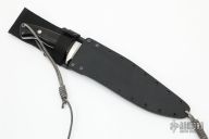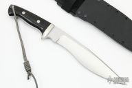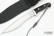 This knife by Tim Britton features a hand rub satin finished recurve blade with .263" blade stock and 1.638" blade depth, full tang construction. The handle has nickel silver bolsters and black linen micarta scales and a lanyard hole at the butt. Comes with a Hendrix kydex sheath. Has some light scratches, otherwise excellent condition. The makers mark is very light, but it is there, you will not be able to see it in the photos. Latrobe BG-42 Steel.