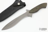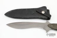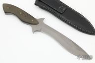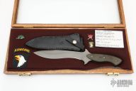 This Combat Fighter by Ray Beers features a bead blasted blade with a sharpened top edge, .242" blade stock and 1.347" blade depth, full tang construction with black linen micarta scales. Comes with a black leather sheath. Dated 1982 on the enclosed paper work and #1 on the ricasso. Excellent condition. Comes with a wooden display case with original receipt and some Special Forces and Airborne pins and patches.