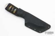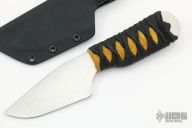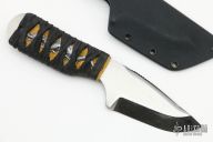 This Hartsfield Style Fixed Blade by Pohan Leu has a chisel grind and satin finish on .250" blade stock and 1.486" blade depth. The handle has black Ito wrap over yellow cord with a dragon menuke. Comes with a kydex sheath. Has some light scratches, otherwise excellent condition. This is an early piece from Pohan.