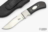 This Integral by Todd Begg features a hand rub satin finished blade with a notched thumbrest, .152" blade stock and 1.161" blade depth, hidden/mortise tang construction. The handle has a textured integral stainless steel guard with a black G-10 grip, lightning strike carbon fiber inlays with gold lip pearl inlays. Comes with a hand tooled brown/black leather sheath with belt loop. Excellent condition. Comes with a zippered case.