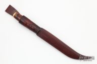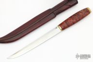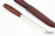 This long Tommi Puukko from Kellam knives features a satin finish blade made from hand forged "Silver Steel", .165" blade stock and .905" blade depth, hidden tang construction with curly birch handle and brass fittings. Includes leather belt sheath. Excellent condition. These knives are made one at a time by one man whose initials are stamped on the blade, this one stamped "OK" stands for "Olavi Kemppainen" from Kuhmo-Finland.