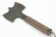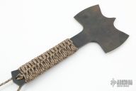 This Double Bit Pack Axe by Duane Dwyer features two blades with a pointed spike between them, .251" blade stock and 5" from edge to edge, cord wrapped handle. Has some light scuffs, otherwise excellent condition.