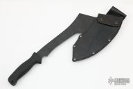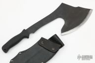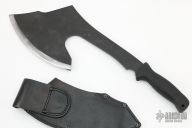 This early Benchmade Axe has the "Benchmade USA" and "Bali-Song" logos on the blade blade, .189" blade stock and an 8" blade, rubber handle. Comes with a black leather sheath. Has some scuffs and scratches, otherwise good condition. Please let us know if you know the name of this model.