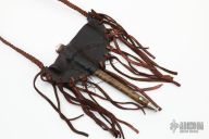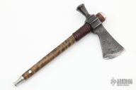 This Miniature Pipe Tomahawk by Ryan Johnson features a hand forged blade/head with a 1.625" cutting edge, 4" from edge to pole. Has a curly maple haft with leather wrap under the head and an antiqued nickel silver cap with a finale that unscrews for the carb of the pipe, has an antiqued nickel silver mouth piece. Excellent condition. Very cool piece. Comes with a brown leather neck sheath.