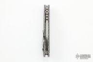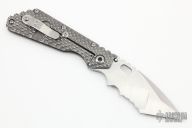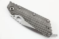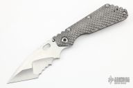 This Mick Strider custom SMF framelock folder has a Nightmare ground tanto partially serrated blade with notched thumbrest and thumbhole. The handle has a double gunner grip titanium frame with laser engraved titanium clip. Includes Hinderer "Lock Bar Stabilizer" for maximum reverse lock retention. Nice lockup, blade seating and detent. Comes with zippered case. New from maker at the 2022 CCKS.