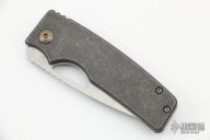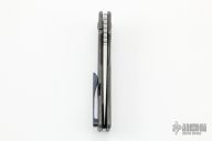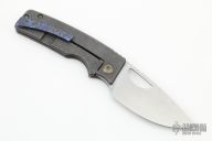 This knife by the OZ Machine Company features a tumbled Magnacut blade with thumbhole and notched thumbrest. The handle features a smooth tumbled titanium frame with a ZircuTi backspacer and tip up pocket clip with hidden screws. Includes box and papers dated 2-23-22 and s/n 565. New condition.