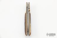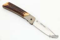 This TTF linerlock folder by Bob Terzuola features a tumbled blade with a thumbstud. The handle has an anodized titanium frame with stag scales.  Nice detent, lockup and blade seating. There are a couple of light scratches on the blade and handle otherwise the knife is in Excellent condition.