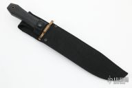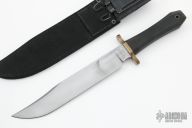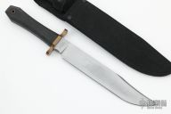 This Australian Bowie by Gerber features a bead blasted clip point blade with a false top edge, .293" blade stock and 1.487" blade depth, hidden tang construction. The handle has a brass guard and rubber handle with lanyard hole. Includes nylon sheath. Oxidation is visible on the blade otherwse the knife is Excellent condition.