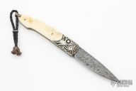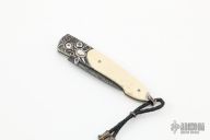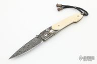 The B10 AG8 AG Russel Exclusive by William Henry features a Mike Norris Hornets Nest Damascus blade with single thumbstud with Sapphire inset in gold bezel. The frame is carved sterling silver with carved pearl skulls, Mammoth ivory scales, Sapphire set in gold bezel the button. The piece exudes a sophisticated elegance sure to please any owner. Includes wooden presentation box, leather pouch, and all paperwork dated June 28, 2011. Excellent condition. #7 of 25