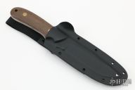This Professional Guides Knife by Dozier Knives features a satin finished blade with .180" blade stock and 1.100" blade depth, full tang construction. The handle has green canvas micarta scales with brass pins and lanyard hole. Comes with kydex sheath with belt loop. Excellent condition.