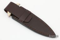 We have made This A.G. Russell Shopmade push dagger letter openers with both giraffe bone scales. Push Daggers were highly favored by gamblers on the early riverboats and in the gold fields of California and Nevada, where they were carried concealed, usually along with a derringer, as protection. Ours was designed for a much less adventurous life. Along with the elegant, deep chocolate brown leather sheath, you’ll not find a letter opener that will generate more interest. The knives are made in our own shop here in Rogers, Arkansas and are marked A.G. Russell™ Shopmade®. The blades are 154CM at 57-59 Rc. The mammoth ivory scales are held in place by mosaic pins and red liners. The leather desktop sheath is made offshore to our design. Comes with original paper wrapping. Excellent condition.