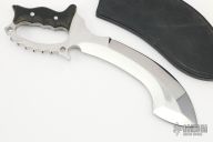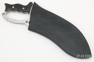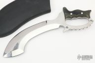 This XL Gladiator D-Guard by Laci Szabo and Robert Newton features a convex double edged mirror polished blade and integral knuckle guard, black canvas micarta scales, .470" blade stock and 3.75" blade depth, full tang construction. Comes with a black leather sheath. Excellent condition.