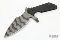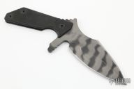 This UUK by Strider is a Laci Szabo design that is #53. It features a tiger striped double edged blade with notched thumbrest, .246" blade stock and 2.115" blade depth, full tang construction. The handle has textured black G-10 scales. Comes with kydex sheath with TekLok. Has some light scuffs otherwise excellent condition.