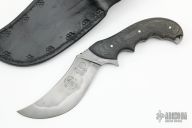 This Fugu by Van Steck is a Laci Szabo design, it features an upswept blade with nice hamon and a fileworked thumbrest, .235" blade stock and 1.607" blade depth, full tang construction. The handle has black canvas micarta scales. Comes with a black leather sheath. Excellent condition.