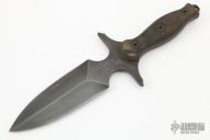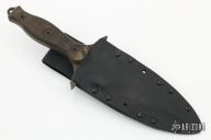 This spear point dagger by Robert Newton is a Laci Szabo deisng, it features a double edged blade with .182" blade stock and 1.758" blade depth, full tang construction. The handle has black canvas micarta scales. Includes a black kydex sheath. Has a couple light scuffs, otherwise excellent condition.