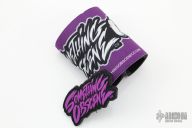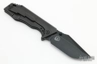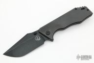 This knife from something obscene features a black tanto drop point blade with notched thumbramp and flipper tab. Has a black finish handle, with black clip and backspacer. Comes with original box, COA dated 9/28/2021, patch, and beer koozie. Shows some wear, otherwise excellent condition.