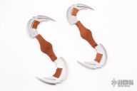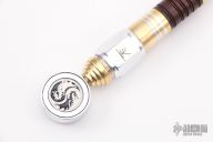 This Dragon Slayer Axe by DV Customs features two stainless steel blades that have .120" blade stock. The maker spent over 120 hours cutting, fitting, drilling, taping, threading, custom making each of the 30 plush pieces to be assembled on a 1/2" threaded rod. One of a kind! The materials used are cocobolo, aluminum and brass. Comes with a wooden wall mount. This mount comes with hooks to be added to hold the sword in the desired display position, and two additional "Side Winders" (not made by the maker, but are included for the display). Comes with COA. New from maker.
