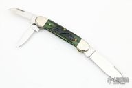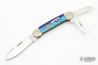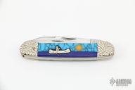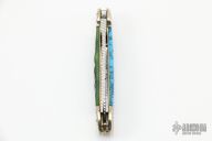 This Cannitler Knife has been customized by Brian Yellowhorse features mirror polished blades with nail nicks. The handle has carved nickel silver bolsters, multi-piece covers, brass liners, stainless steel spring. Comes with original box and papers. Excellent condition.
