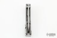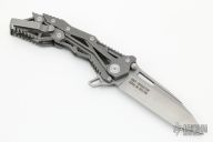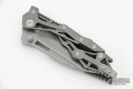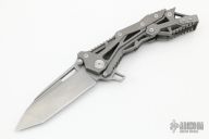 This QTR-11 from Quartermaster Knives features a stonewashed drop point blade with dual thumb studs, notched thumb rest and flipper. The handle is comprised of satin finished titanium, and stainless steel tip up clip. This knife is a G&G Hawk design. Includes original box and COA dated 1-1-16 and #53/100. Excellent condition.